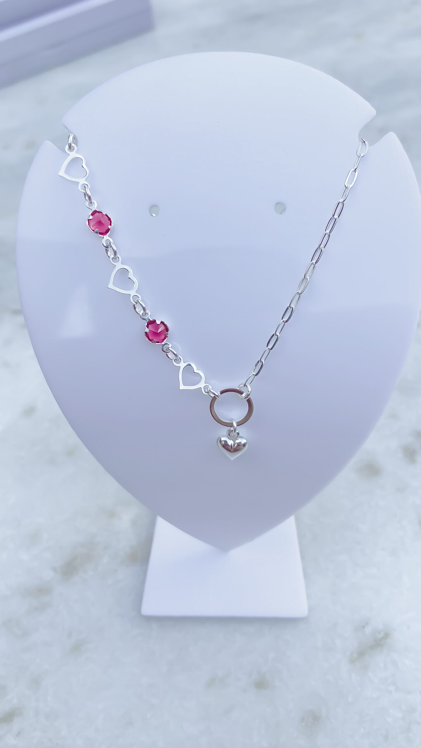 Demonstre amor com a Pulseira Coração Vazado e Pedra Vermelha em Prata 925. Com design único, ela tem elos de coração vazado, pedras vermelhas e um pingente de coração. Perfeita para quem ama peças românticas e cheias de personalidade.